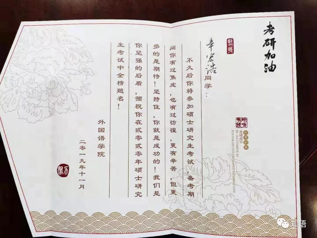 贺卡上写着,“不久后你将参加硕士研究生考试,备考期间你有过焦虑,也有过彷徨,更有辛苦,但更多的是期待!坚持住,你就是成功的!我们是你坚强的后盾,预祝你在2020年硕士研究生考试中金榜题名!”这一字一句的祝福舒缓了考研学子备考的紧张,温暖了他们的心。